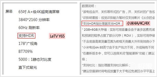 1、小米4A/4X/4C在官网介绍中,最底下补充了一句:“支持HDR指处理器支持HDR,而液晶面板不支持HDR”,等同于不支持HDR显示。而乐融Letv Y65的数据中显示,屏幕和处理器均支持HDR,这个对喜欢玩PS4 Pro的我来说很有用。