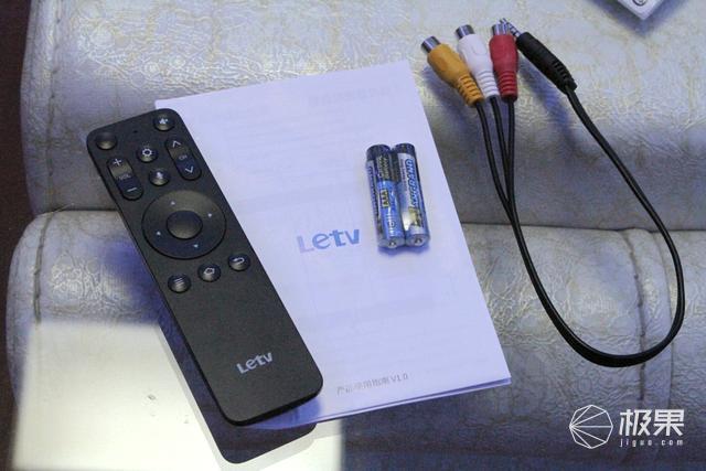 乐融Letv Y65超级电视的全套配件干净零落,分别是16键的蓝牙语音遥控器,两节7号电池和一根转接线。