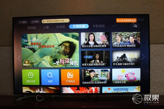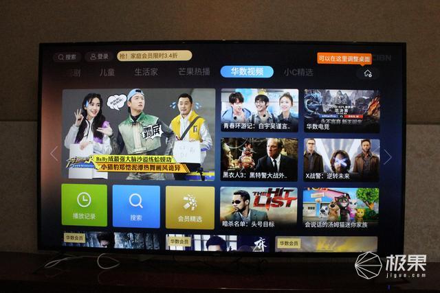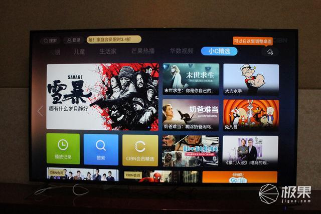 在电视内容方面,乐融Letv Y65超级电视覆盖了腾讯、芒果、华数TV、CIBN和华影时光五大内容平台,可以直接切换主屏的轮播界面(上面有写芒果热播、华数视频、小C精选等);像最新的《极限挑战》第五季、《明日之子》第三季、《奔跑吧》第三季等综艺节目,以及《少年派》、《封神榜》、《秦岭神树》等热播电视剧都能看。