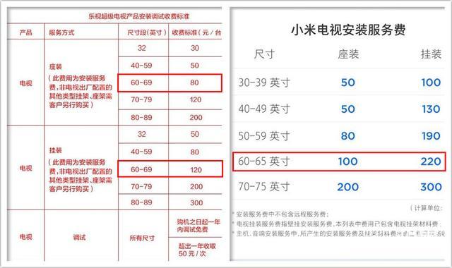 当然,如果需要售后安装,那么乐融Letv的安装费还是比较合理的,上面拿小米电视的安装收费标准来对比。可以看到,乐融Letv安装一台65英寸电视分别是80元(座装)和120元(挂装,挂架自行购买,大概25-70元左右)。小米安装一台65英寸电视分别是100元(座装)和220元(挂装,包含挂架)。