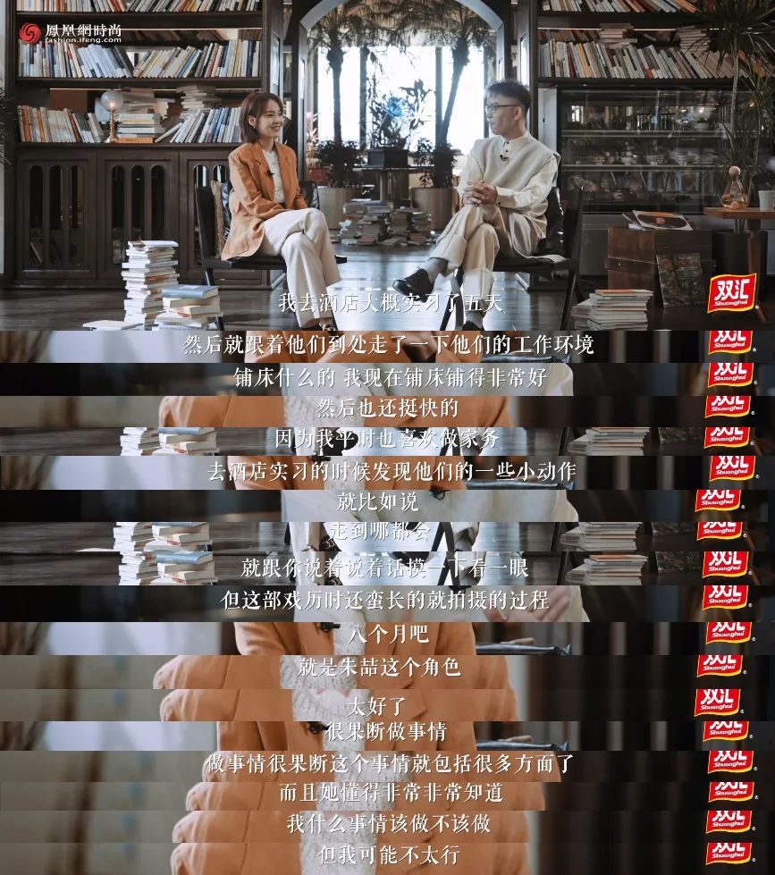 在观众翘首以盼的电视剧《欢乐颂3》中,由她饰演的酒店经理朱喆是一位职场女强人,她透露自己在准备这个角色时去酒店实习了5天,通过真正学习和操练了解了作为一名酒店工作人员的日常状态与工作习惯,“他们会有一些说话的小细节,比如看到什么环境,事先眼神扫一遍,如果哪里不行直接否决。“