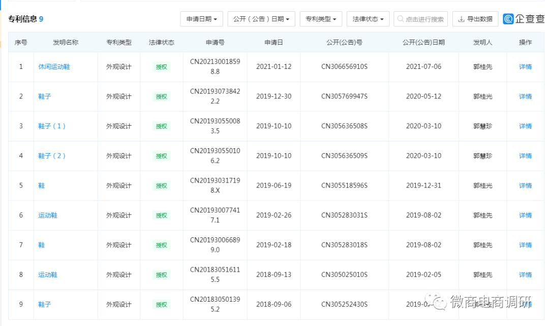 工商信息显示,江西双特体育用品股份有限公司注册地为江西省赣州市石城县琴江镇,法定代表人陈谷秀,注册资本500万元。据其官方宣传,双特公司占地120余亩,拥有标准化厂房及4条现代化生产制鞋设备和各层制鞋精1100余人,申请了几十个国家专利,但是工商信息显示双特公司的参保人数为0人,专利信息中拥有9项鞋子专利授权,与其宣称的几十项出入较大。