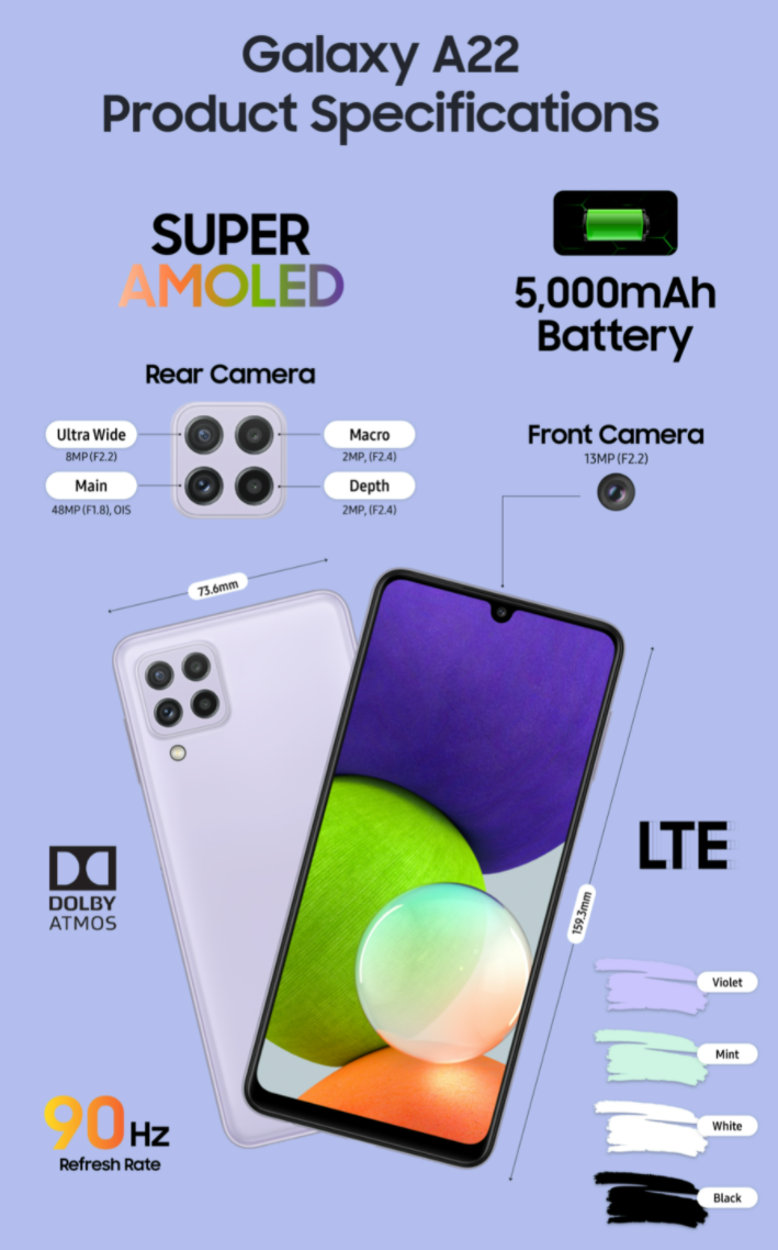此外,该手机还支持侧边指纹识别,支持蓝牙 5.0 和 NFC,保留了 3.5 毫米耳机插孔,拥有 5000mAh 电池,支持 15W 充电。三星 Galaxy A22 手机提供商黑色、薄荷色、紫罗兰色和白色四种配色。三星目前还未公布其定价。
