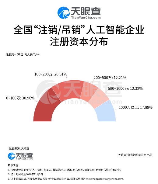 天眼查数据显示,全国共有9.2万家人工智能企业注销、吊销,其中约6.8万家注销、吊销的企业为创业型企业(成立时间小于等于5年)。在“死”掉的这些企业中,不乏一些已有一定实力的企业, 其中1.3万家企业的注册资本超过1000万,206 家企业有公开融资事件。