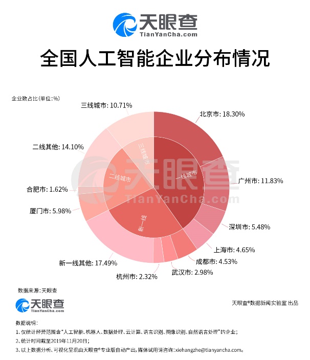 那么,人工智能企业,集中在我国的哪些区域?天眼查数据显示,一线、新一线城市汇聚了大量人工智能企业,广东、北京等经济发达地区,是AI企业的聚集地。