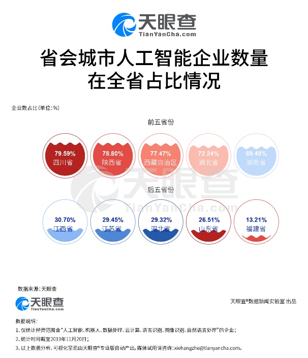 值得注意的是,在二线城市中,出现了一匹黑马,即福建省厦门市,人工智能企业数超过 4.4万家,约占福建全省的70%。不过,从全国范围内的各个省份情况来看,由于省会城市往往拥有较强的经济实力、科研实力、人才实力等,因此人工智能企业大多集中在省会城市。也有一些特例,包括上面提到的福建省、山东省等。