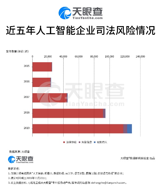 同样需要关注的,是人工智能行业的经营和司法风险。天眼查数据显示,2016年,人工智能行业首次出现了严重违法企业。现如今,严重违法企业已激增到1,743家。从司法风险来看,AI企业的法律诉讼案件数量持续上涨,2018年达117,894余件。在AI行业中,对于社会越来越关注的失信、被执行人企业的数量,也不断升高。这也印证了一句话“只有潮水褪去,才知道谁在裸泳。”
