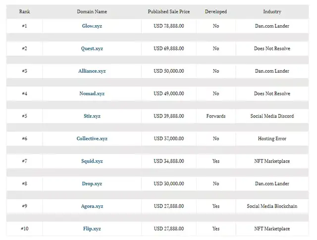 其中,以$78,888美元交易的Glow.xyz是2021年.xyz域名的最高销售。