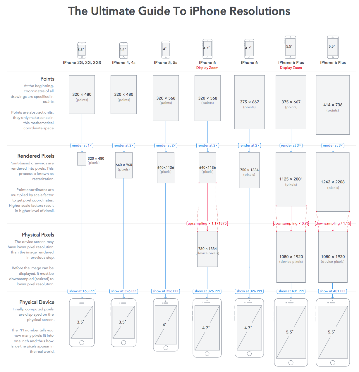 [b]即在同一物理长度pt长度下,iphone4的屏幕像素密度是iPhone3GS的2倍,因此像素分辨率是iphone3gs的2倍。[/b] 这也就是为什么当我们在做iOS客户端的设计时候(通常我们以@2x来设计),开发说的图片尺寸多少pt,换算成要乘以2的原因了(如果我们做iphone6+的设计要在pt数×3)的由来了。 再去看iphone的各个尺寸就很简单了。可以看出iphone的屏幕密度只有3种,即 @1x,163ppi(iphone3gs) @2x,326ppi(iphone4、4s、5、5s、6) @3x,401ppi(iphone6+)