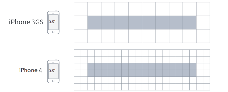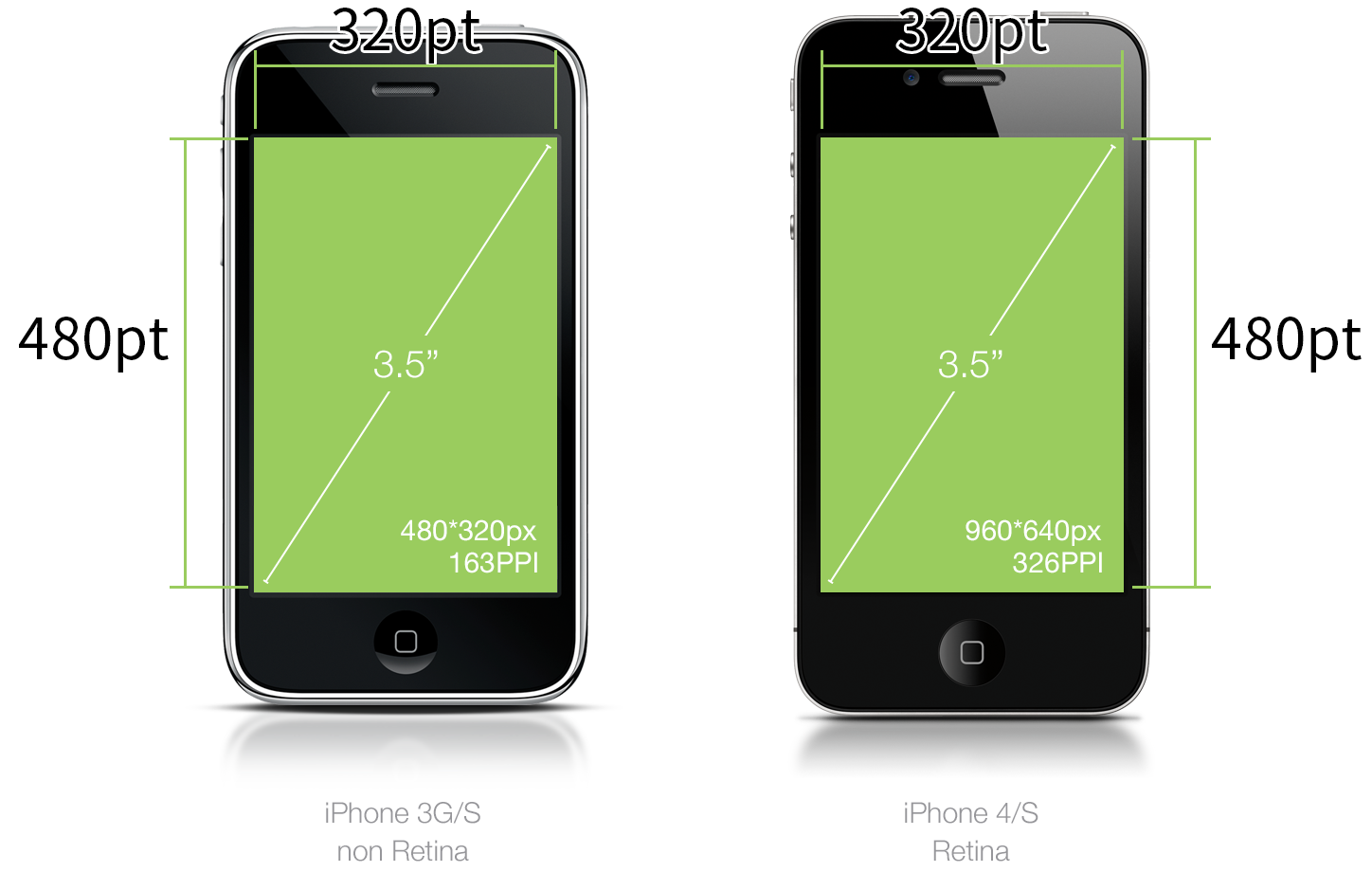 由于iphone3GS和iphone4的物理屏幕尺寸的大小是一样的,所以,他们的pt是相同的。但是由于iphone4的现实像素为960px×640px,也就是说每英寸在iphone4的屏幕下显示了326个像素(刚好是iphone3GS的2倍)。