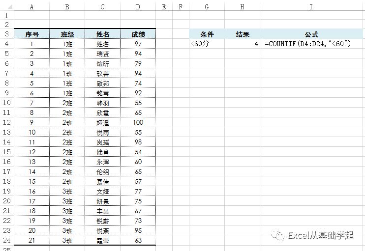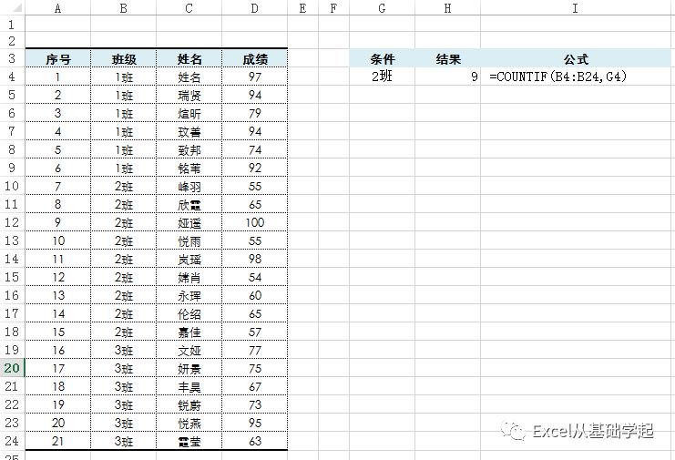 即表示,计算B4:B24区域中“2班”的个数,即为表中2班的人数。