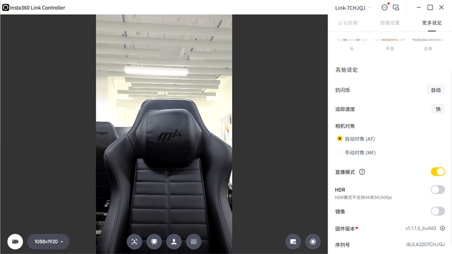 想要开启上述功能,需要专用的软件的配合,在电脑中下载并安装Insta360 Link Controller这款软件,提供云台控制、图像设置、手势动作的开关以及软件的升级等功能。软件提供的功能非常丰富,还有设置构图、抗闪烁等功能,基本上想要调整的地方,Insta360 Link Controller多数都能做到。