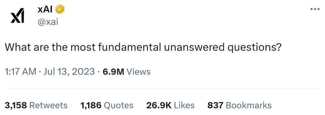 宇宙包罗万象,需要解决的问题何止千万。xAI 发表了第一条推文,「最根本的尚未解答的问题是什么?」