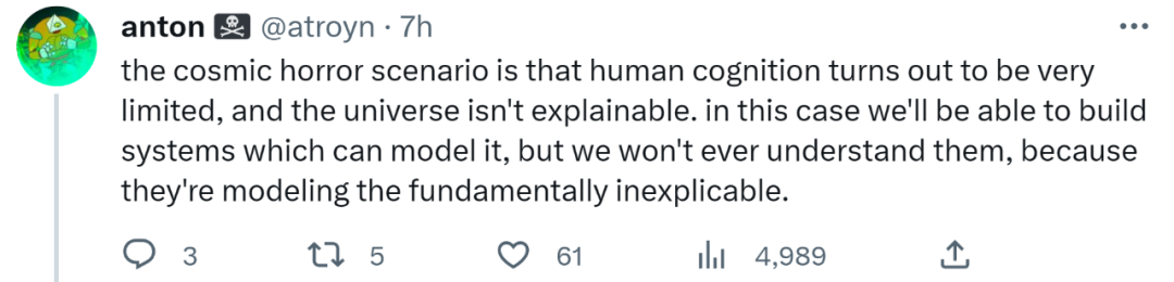 最后他表示,宇宙的恐怖之处在于人类认知非常有限,而宇宙是无法解释的。在这种情况下,我们能够构建对宇宙进行建模的系统,但永远不能理解它们,因为正在建模的东西在根本上无法解释。