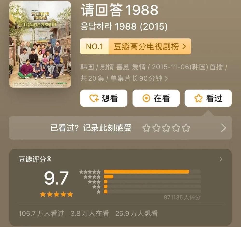 将近十年过去了,《请回答1988》在豆瓣依旧坚挺地保持着9.7的高分,有着106万人看过。这样的成绩,让不少创作者都希望,可以打造一部“国产《请回答1988》”。