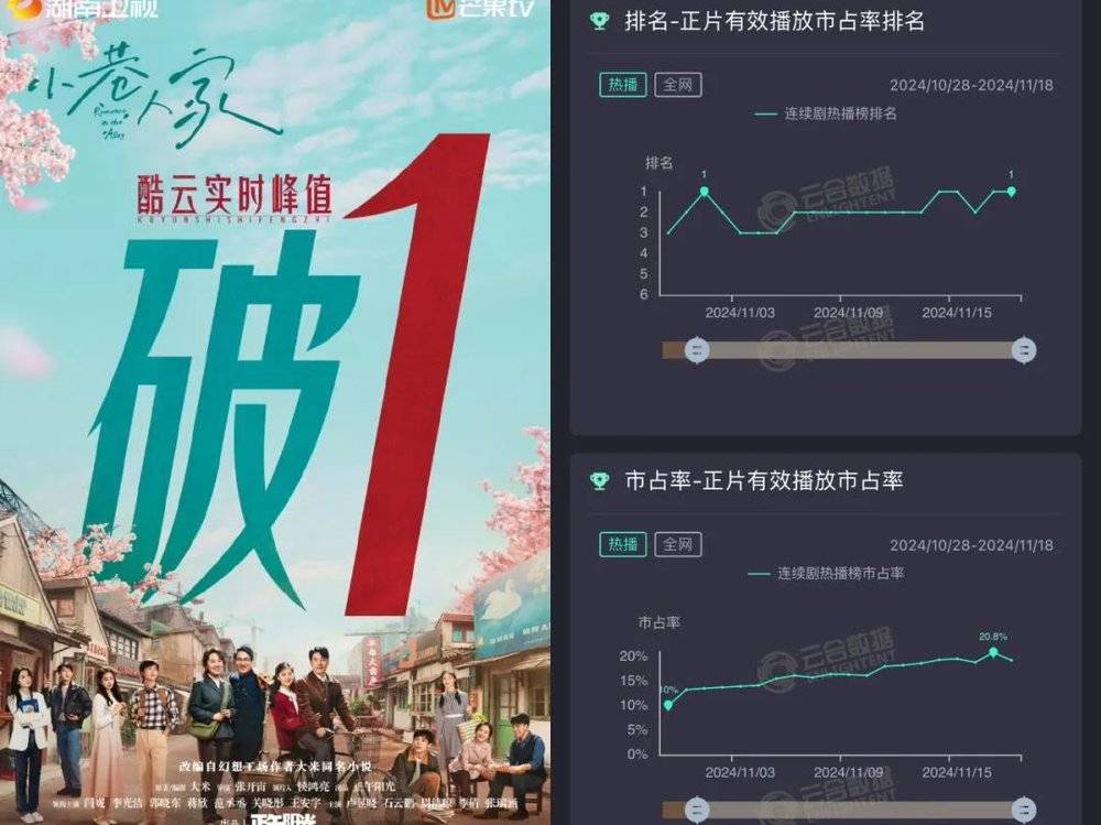 作为一部台网同播剧,不仅收视破1,成为湖南卫视下半年收视冠军,网播平台也占据榜首位置,正片有效播放市占率最高达20.8%。