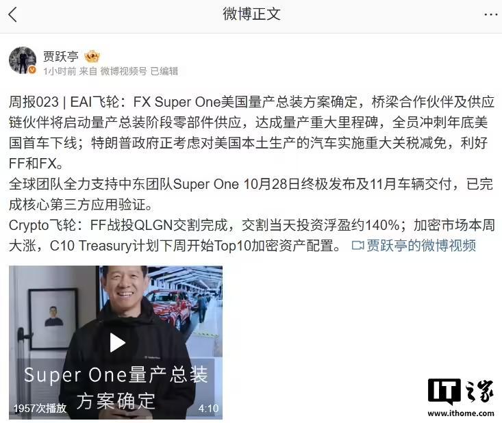 IT之家 10 月 6 日消息,贾跃亭今日发布“周报第 23 期”,称 FX Super One 美国量产总装方案确定,桥梁合作伙伴及供应链伙伴将启动量产总装阶段零部件供应,达成量产重大里程碑,全员冲刺年底美国首车下线。
