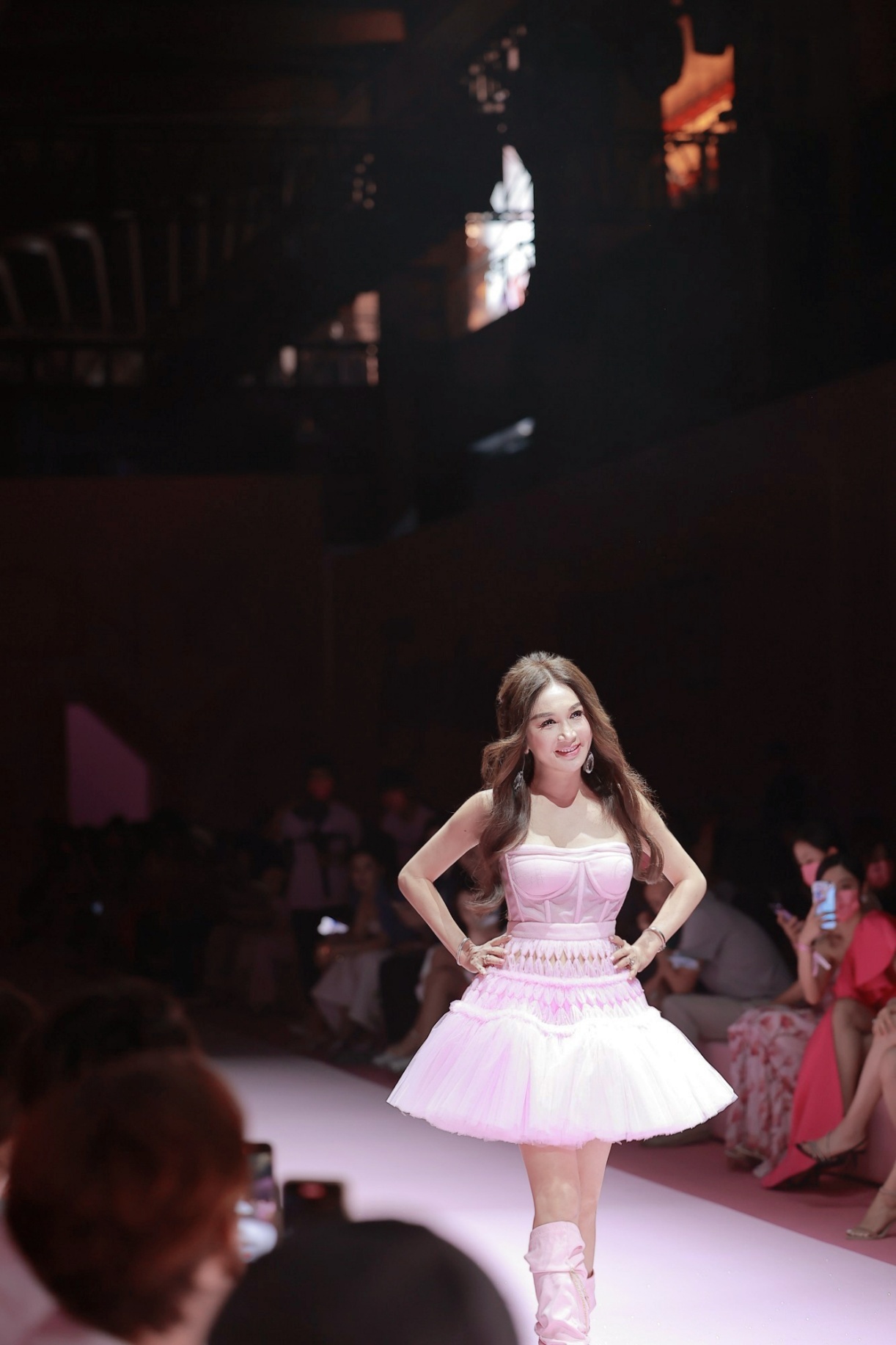 踩着音律的节拍,温碧霞身着丰盈饱满的粉色短纱裙领先出场,灵动俏皮感,朦胧的竖条纹凸显虚实之魅,精致的裁剪让立体堆叠的设计更轻盈,整体造型轻快明亮,仿佛粉色仙子一般缓缓而出,裙袂之间邂逅美好。