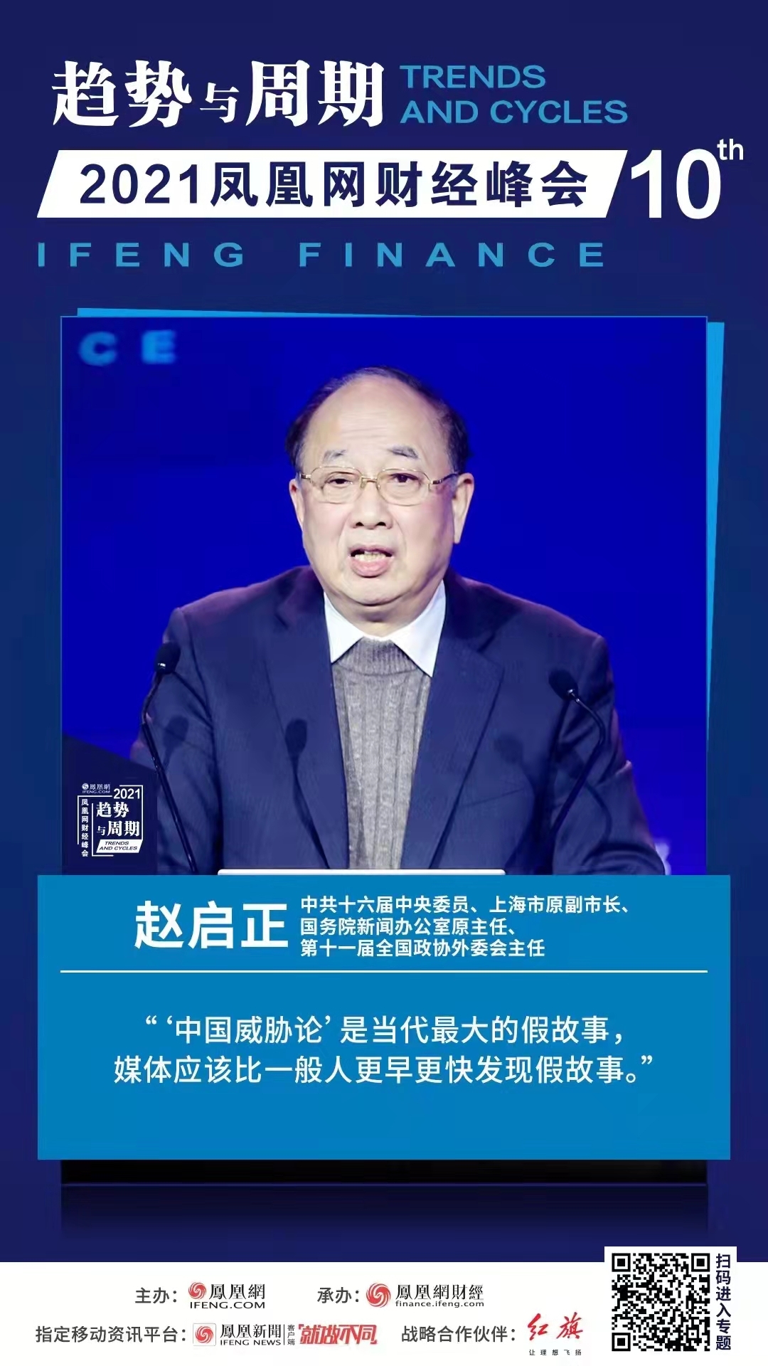 在凤凰网财经峰会的现场演讲中,赵启正还阐述了“加强媒体融合”以及“加强媒体与智库的融合”对于讲好中国故事,反驳假故事的重要作用。