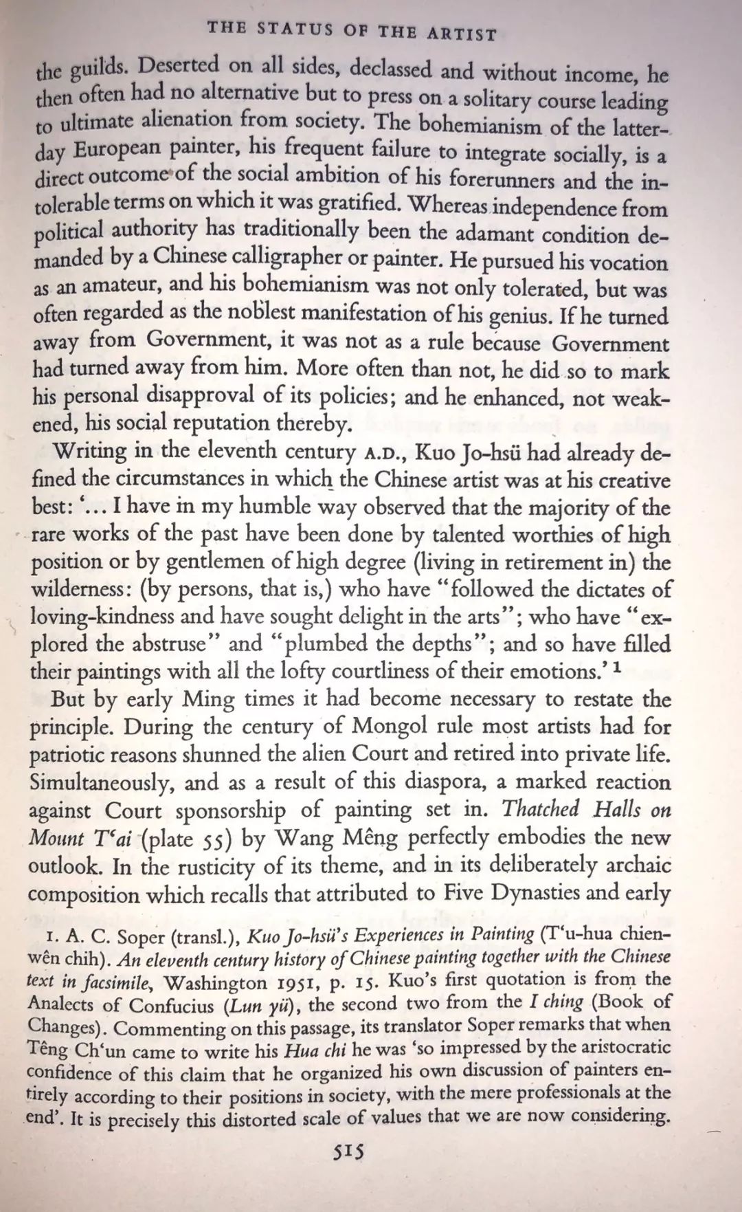 职位和高薪水对于身处要职的中国艺术家来说,使得他们免于担忧,而两种(社会地位和金钱的)担忧始终困扰着西方艺术家。首先,中国书画家的社会受欢迎程度并不依赖于其艺术家的身份;第二,他们并不需要为自己的作品寻求赞助。他们可以自由发展自己的书画天赋,不必被社会野心和权宜之计所干扰。在艺术家的角色中,他不亏欠任何人。正如元代的山水画家倪瓒所言,他们作画只是自娱而已。
