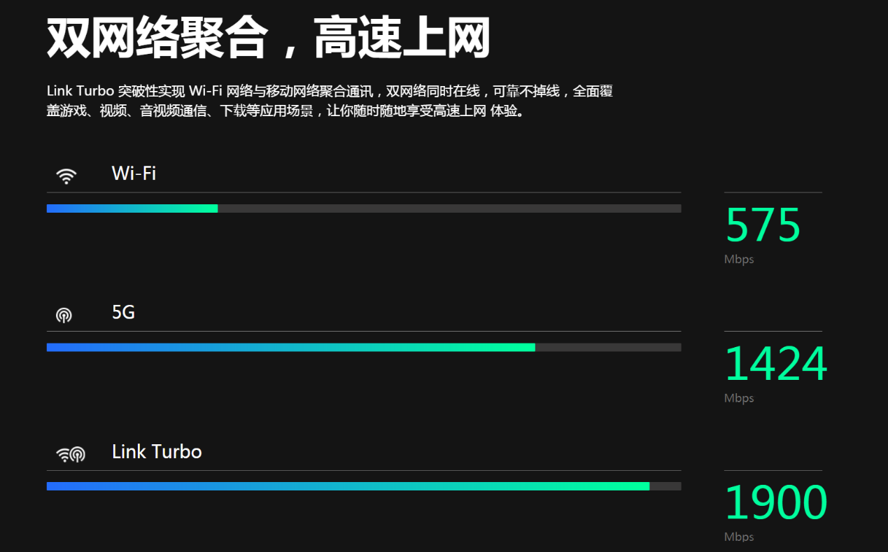 “Link Turbo”中文名叫做“全网络聚合加速技术”,被媒体誉为5G前夜的“网络加速器”。其诞生的时间是2018年12月26日,也就是中国5G商用前的6个月。而随着全球首款集成SA/NSA双模5G基带的麒麟990 5G芯片横空出世,以及首款搭载麒麟990 5G芯片的手机“5G版Mate 30”正式开卖,Link Turbo技术的加持也将带来更高速的上网体验。