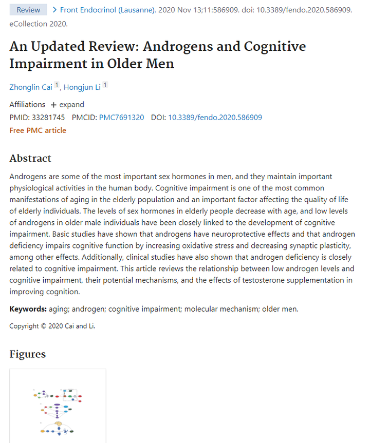 北京协和医院 泌尿外科 李宏军 教授等人曾回顾性总结81篇相关文献,并在“Frontiers in Endocrinology”上发表文章“An Updated Review: Androgens and Cognitive Impairment in Older Men”,对老年男性雄激素缺乏与认知功能障碍的关系进行了系统分析。