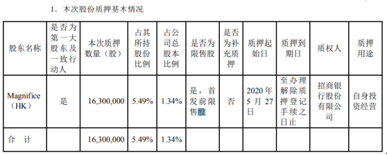 本次质押股份1630万股,占其所持公司股份的5.49%。质押期限为2020年5月27日至办理解除质押登记手续之日止。