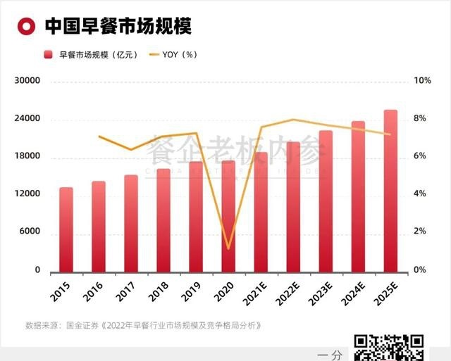 《2022年早餐行业市场规模及竞争格局分析》显示,早餐场景目前行业规模约2万亿元,预计行业规模将持续增长,至2025年可达2.6亿元。