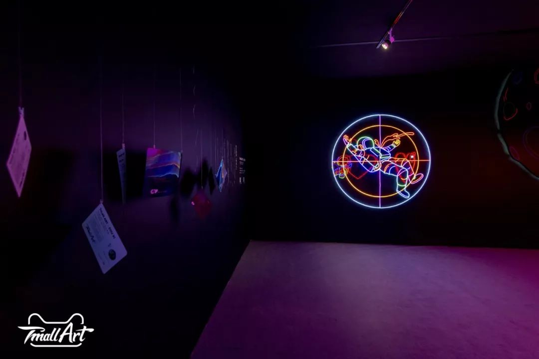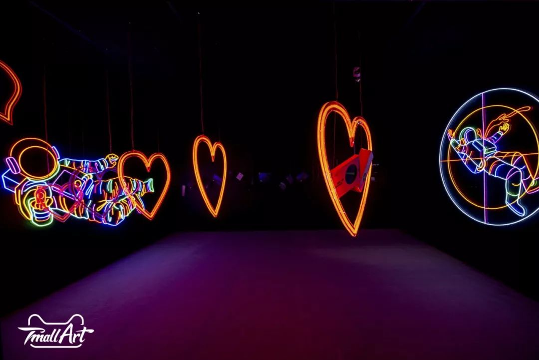 以室内体验区为例,在黑暗太空的背景之下,灯影斑驳,光影间四组宇航员的“爱心”被抽离出来,趣味层次排列下,闪烁而耀眼,重叠光影间的立体化呈现带来了强烈的感官冲击,打造了一场现代艺术盛宴。