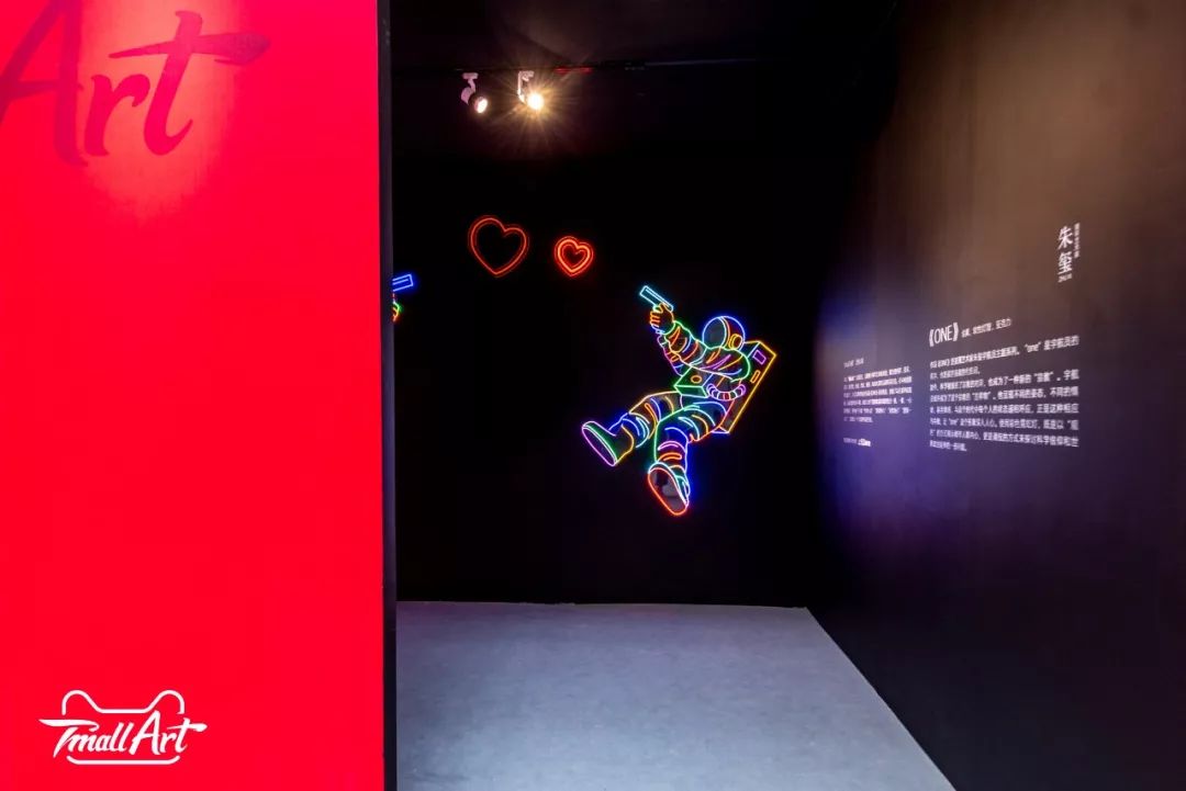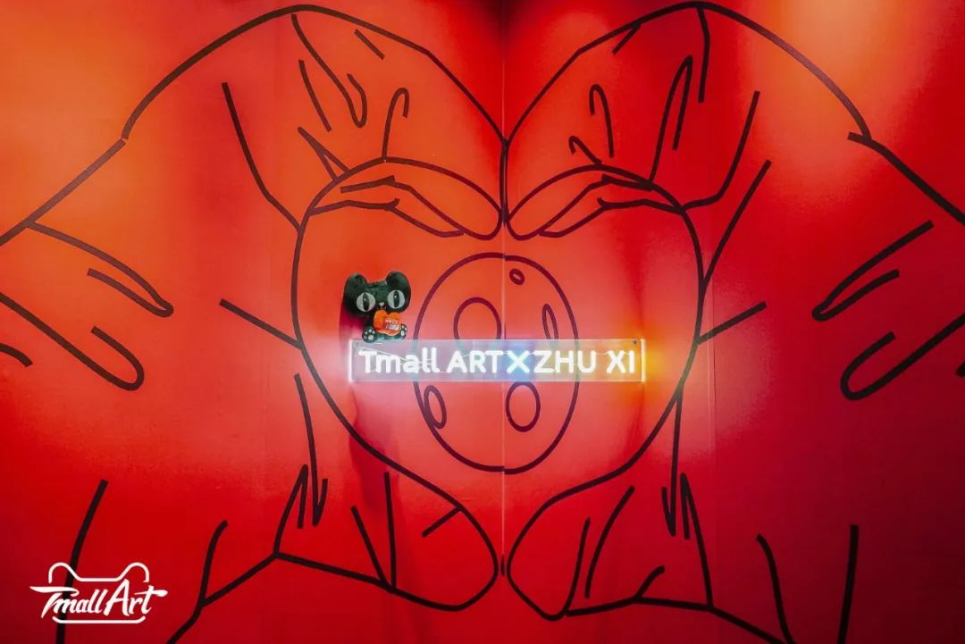 展位设计以天猫红为主色调,线条式的创意图案穿插于整个展馆,分区式的展览场景排布,以及融合现代技术的作品呈现,带给观众独特的现代艺术观展体验。