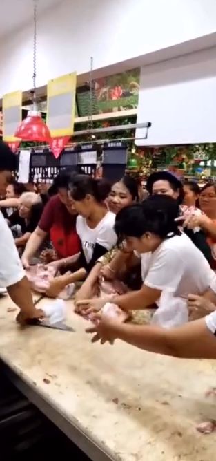 在生鲜区,几个上海大妈为了抢夺最后的几块猪肉相互“拔河”,差点就把猪肉撕成几半了: