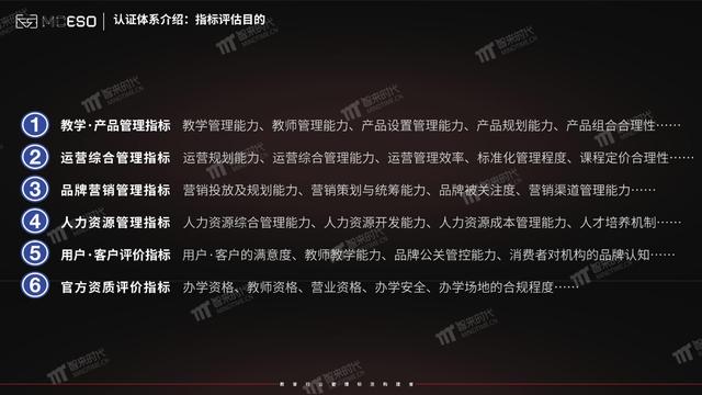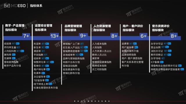 MCESO 教育健康指标体系,是智来时代在五年培训教育行业研究的基础之上发展起来的多维健康经营管理指标认证、指标评估体系,是对K12⺠办培训教育机构可量化指标、可明确留下管理行为或管理痕迹的评估。ESO主要针对K12⺠办培训教育 机构设定:教学和产品管理指标、运营综合管理指标、品牌营销管理指标、人力资源管理指标、用户与客户评价指标、官方资质 评价指标六大模块,实现对培训教育行业或教育机构全生命周期内多维经营管理健康指标的评估与自我检测。