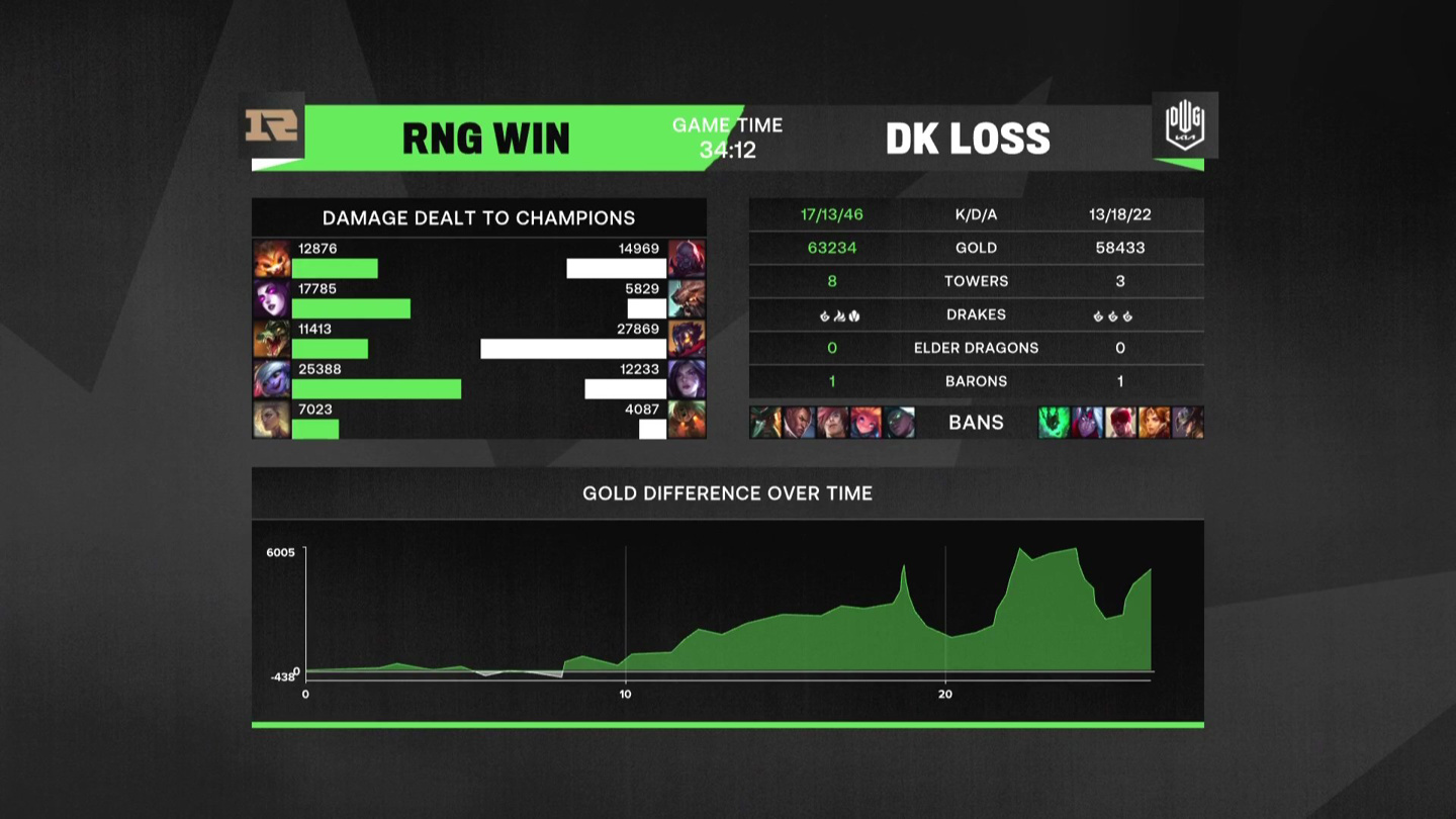 34 分钟,DK 先手小龙乌迪尔惩戒拿下,此时纳尔变大如来神掌拍晕四人!芮尔、鳄鱼不断给到控制,小炮无压力输出成功收割,最终 RNG 团灭 DK 一波赢下比赛。