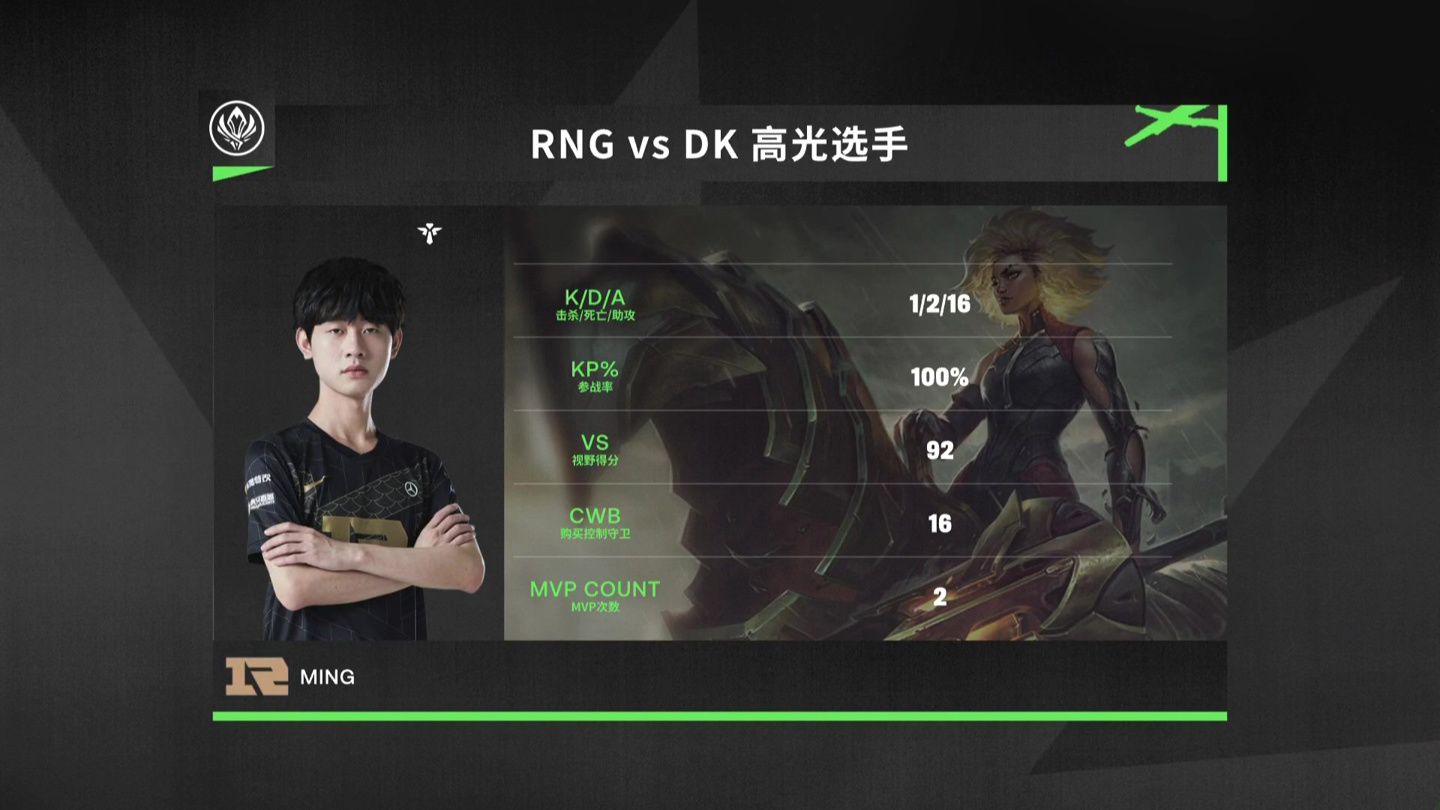 本场比赛 MVP 给到了 100% 参团率对线游走打团完美发挥的 RNG.Ming(芮尔)。