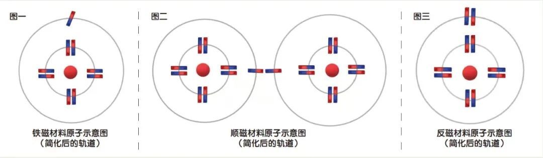 在铁磁材料中,原子外部有奇数个电子(如图一)。在内层轨道中,相反自旋方向的电子两两成对——就像两块连接在一起的条形磁铁,它们的磁矩被抵消了。但是在外层,孤独的电子没有“伴侣”,它的自旋不能被抵消,它可以四处移动。这意味着,在磁场存在的情况下,这个电子与磁场方向对齐排列,将原子变成一个微小的磁铁。