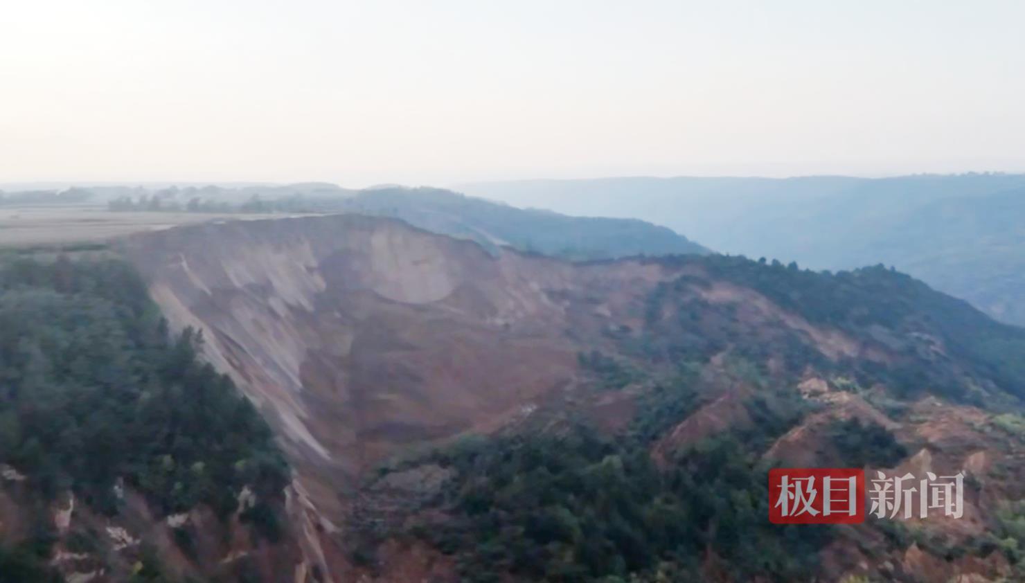 航拍视频显示,黄土塬一侧山体坍塌,下方的土方量较大,斜坡上的绿植被推向前方。