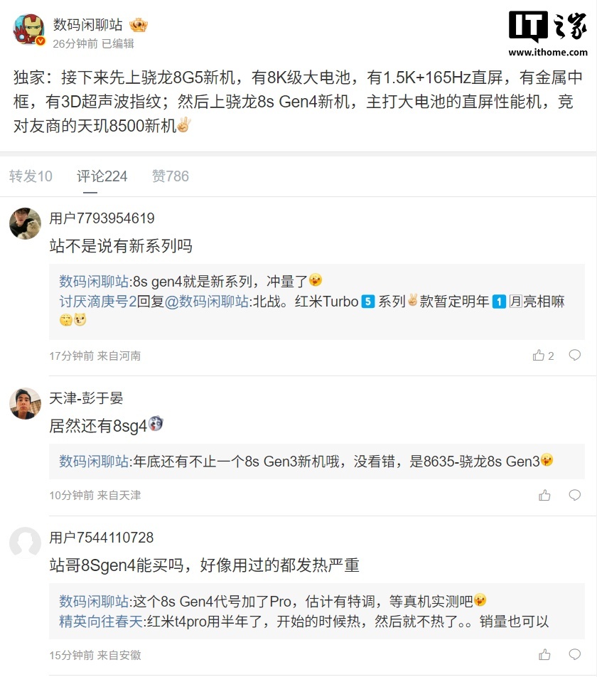 此外,博主还表示“8s Gen4 就是新系列,冲量了”,并称“这个 8s Gen4 代号加了 Pro,估计有特调,等真机实测吧”。