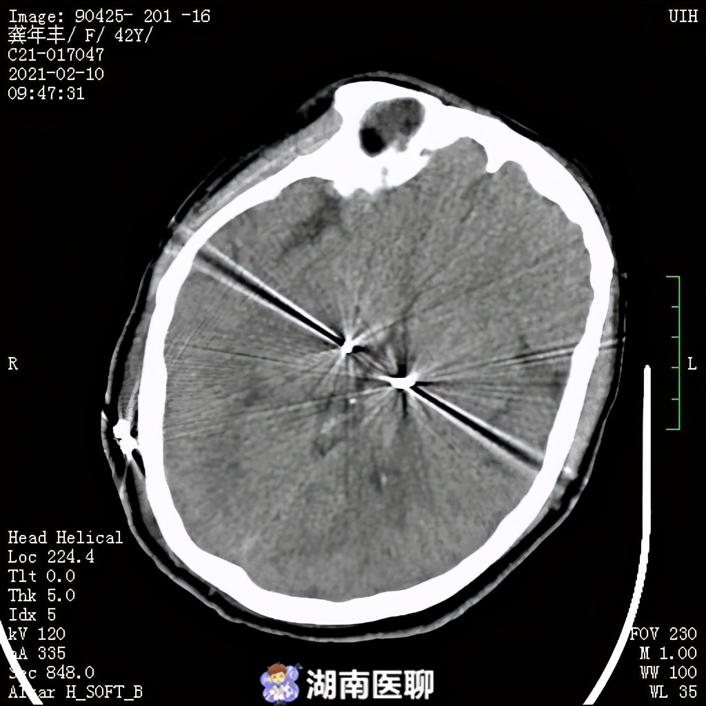 术后复查CT显示,“脑起搏器”准确无误植入靶点丘脑底核(STN核)。