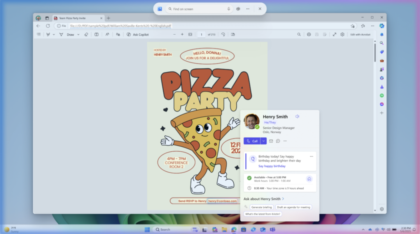 Click to Do 现已集成 Microsoft 365 实时个人卡片,用户可以在利用 Click to Do 查看邮件时,使用“Win + Click”直接查看他人的联系方式,查找过去的协作记录。