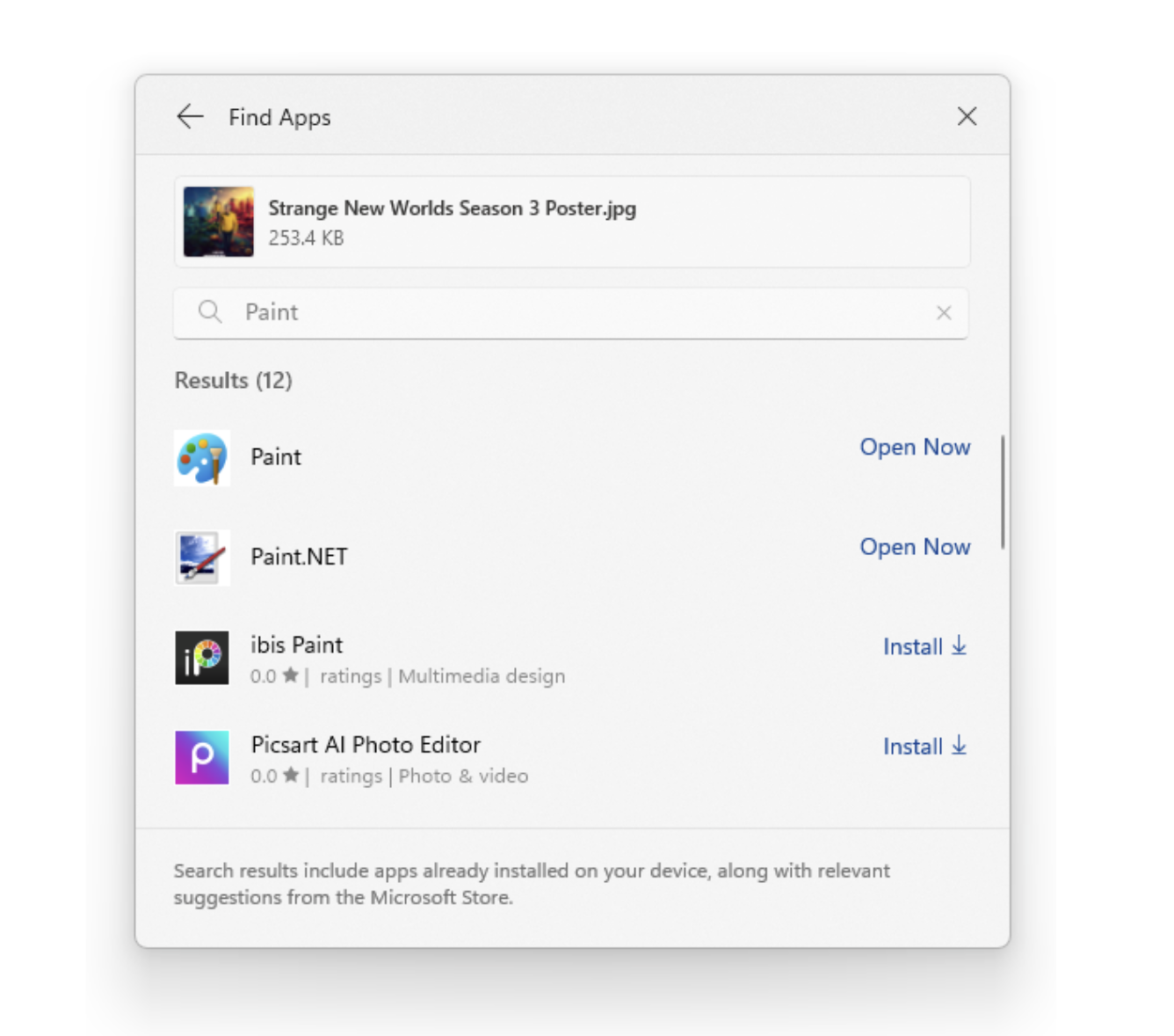 用户目前可以在 Windows 共享窗口的“使用以下方式共享”直接查找已安装在 PC 上的应用或 Microsoft Store 中可用的应用。