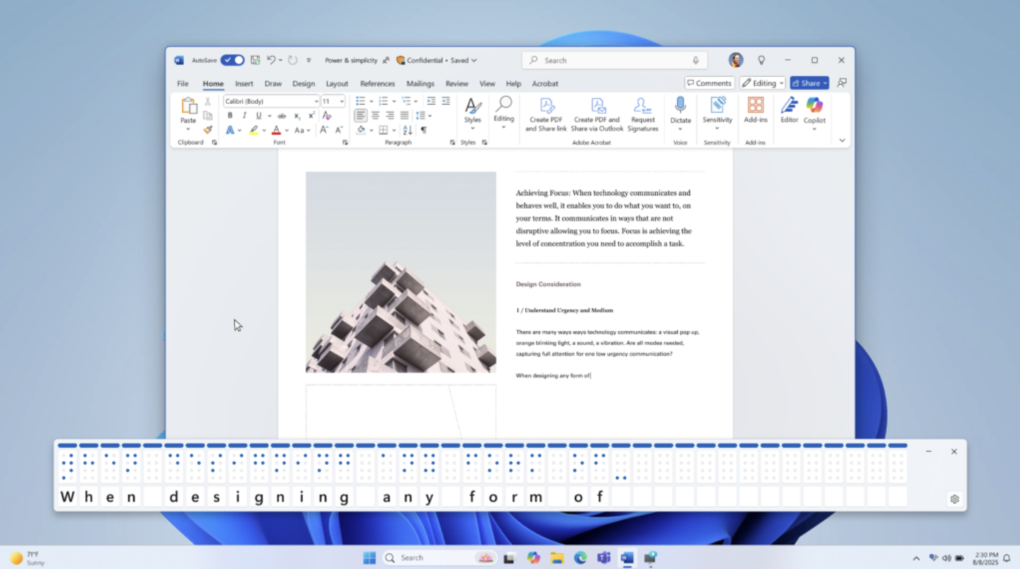微软为讲述人 (Narrator) 应用中新增了盲文查看器 (Braille viewer),它能在屏幕上显示与点显器同步的文本和盲文输出,以帮助缺少盲文点显器的教师、辅助技术培训师、开发人员和测试人员进行辅助教学或技术测试。