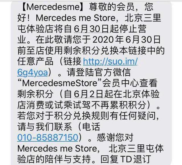近日,部分Mercedes me会员收到一则短信,被告知Mercedes me北京三里屯体验店将于6月30日停止运营,提醒会员尽快使用积分兑换产品。6月2日起,在北京体验店消费或试乘试驾不再积累积分。