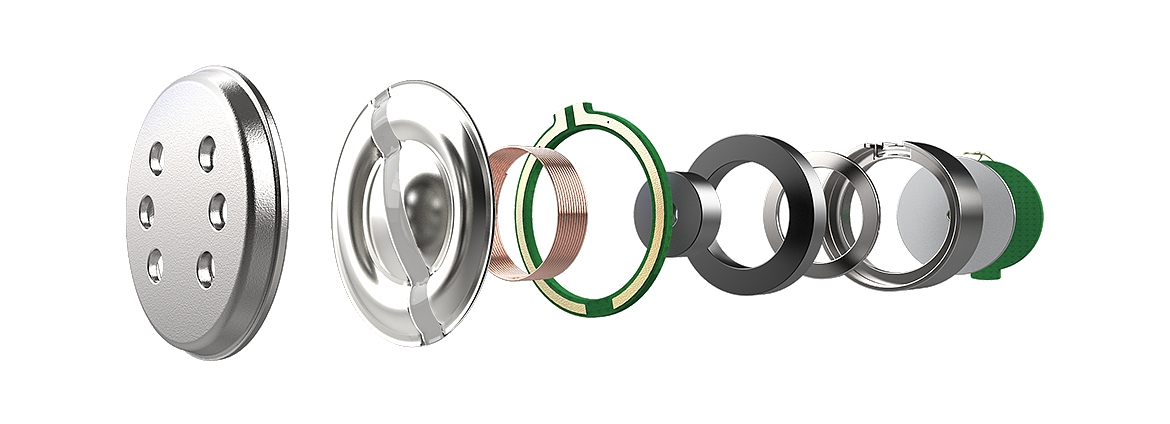 这个UPM单元属于结构升级类型的新技术成果,官方的中文名是:平衡振动技术单元,其特点是无导线振膜,一般动圈单元都需要有两条导线连接到振膜上,用作驱动单元的导线,而UPM单元则是去掉这两根导线,换成能够代替这两根导线通电的镀膜,这样就可以让振膜整体的振动方式更加平稳,也能让振膜的振动幅度更大,实现更大的频响范围。
