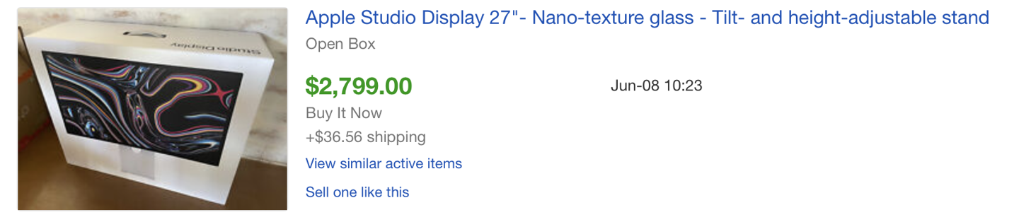 与往常一样,当供应短缺影响需求产品的可用性时,eBay 上的黄牛和经销商正在倒卖赚钱。在 eBay 上快速搜索已完成和已售出的商品表明“新款”和“已开箱”的 Studio Displays 售价超过苹果官方建议零售价。归类为“二手”的商品通常以零售价出售,甚至加价。