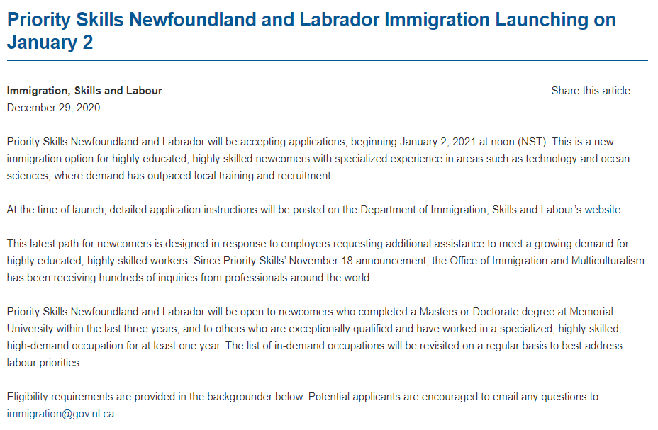 加拿大NL(纽芬兰与拉布拉多/Newfoundland & Labrador)省从2021年1月2日起,将开放“优先职业”移民类别。门槛全加拿大最低,无需雇主offer要求,只要有一年以上相关职业经验就有机会申请 一步到位 全家移民加拿大。