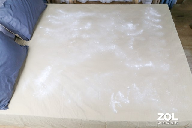 但是对于螨虫的清洁可不仅仅是表面,螨虫等过敏原很多藏在床褥里面或者床垫下面,所以大吸力的清洁非常有必要。我们将白色粉末洒在床上,然后上面盖上床单,模拟真实的螨虫生活的区域进行清洁。