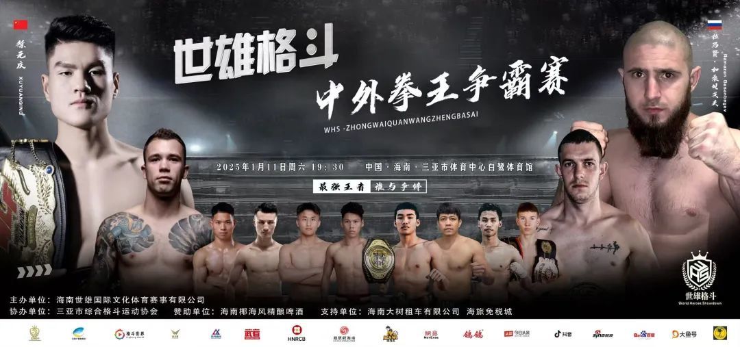 北京时间1月11日晚19点30分,2025年首场中外顶级大战,WHS世雄格斗中外拳王争霸赛暨世雄格斗系列赛启动赛即将在海南三亚震撼开战,比赛当天共有7场高水平、高含金量的中外大战以及两场国外高手间的对决。