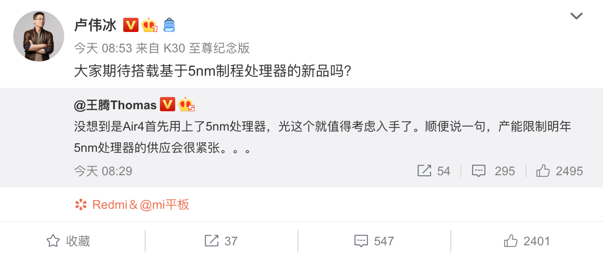 另外,就在A14以及iPad Air 4发布后不久,红米负责人卢伟冰在微博上暗示会有搭载5nm制程处理器的产品。爆料博主@数码闲聊站也表示,Redmi K40 Pro将会在明年一季度发布,搭载骁龙875芯片。此外,也有消息称,骁龙875将会在今年12月份发布,明年春季估计是安卓旗舰新机密集推出的时间段。