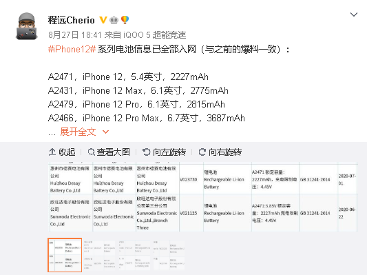然而,根据之前的爆料,iPhone 12系列四款机型电池容量缩水严重,最低2227mAh,最高也只有3687mAh。而且,要考虑到5G以及Pro版上的高刷屏给功耗带来的压力,iPhone 12系列最乐观的情况可能就是续航和iPhone 11系列持平。