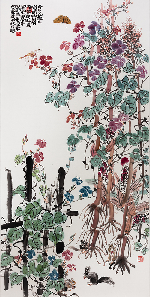 牵牛花艳五彩间,恰似飞蝶舞翩(138厘米x68厘米)。荆桂秋2020年创作